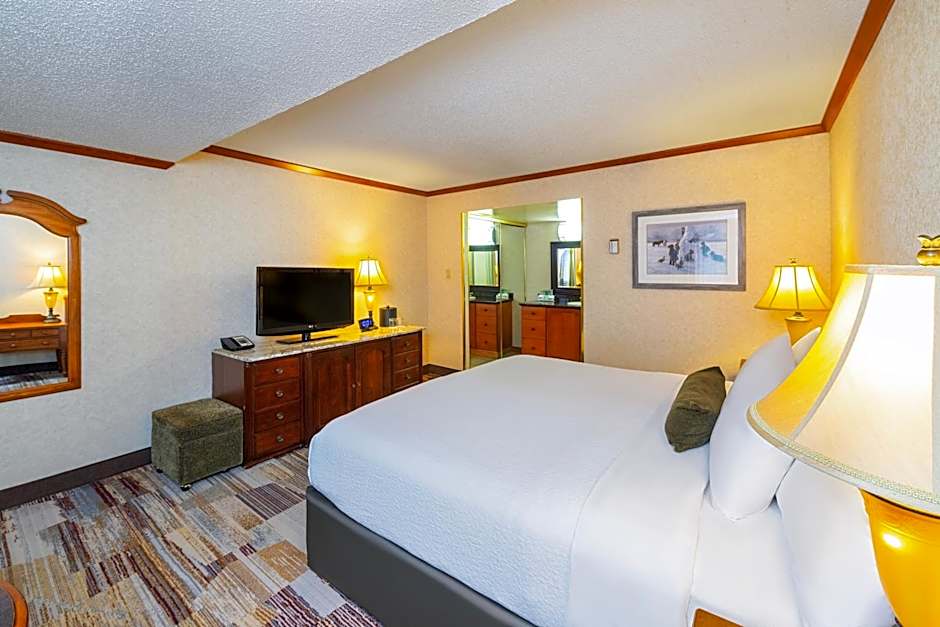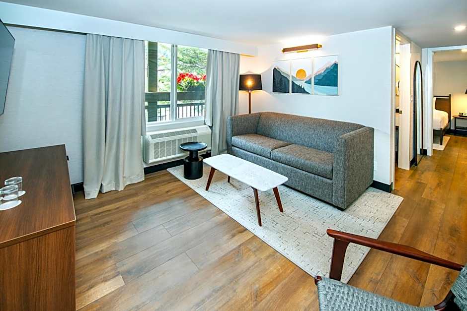 Featuring vaulted cedar ceilings, this 2 level suite provides a granite gas fireplace, sitting area and a loft bedroom. 2 flat-screen TVs are available, one in the living room and one in the bedroom. Free WiFi is included.